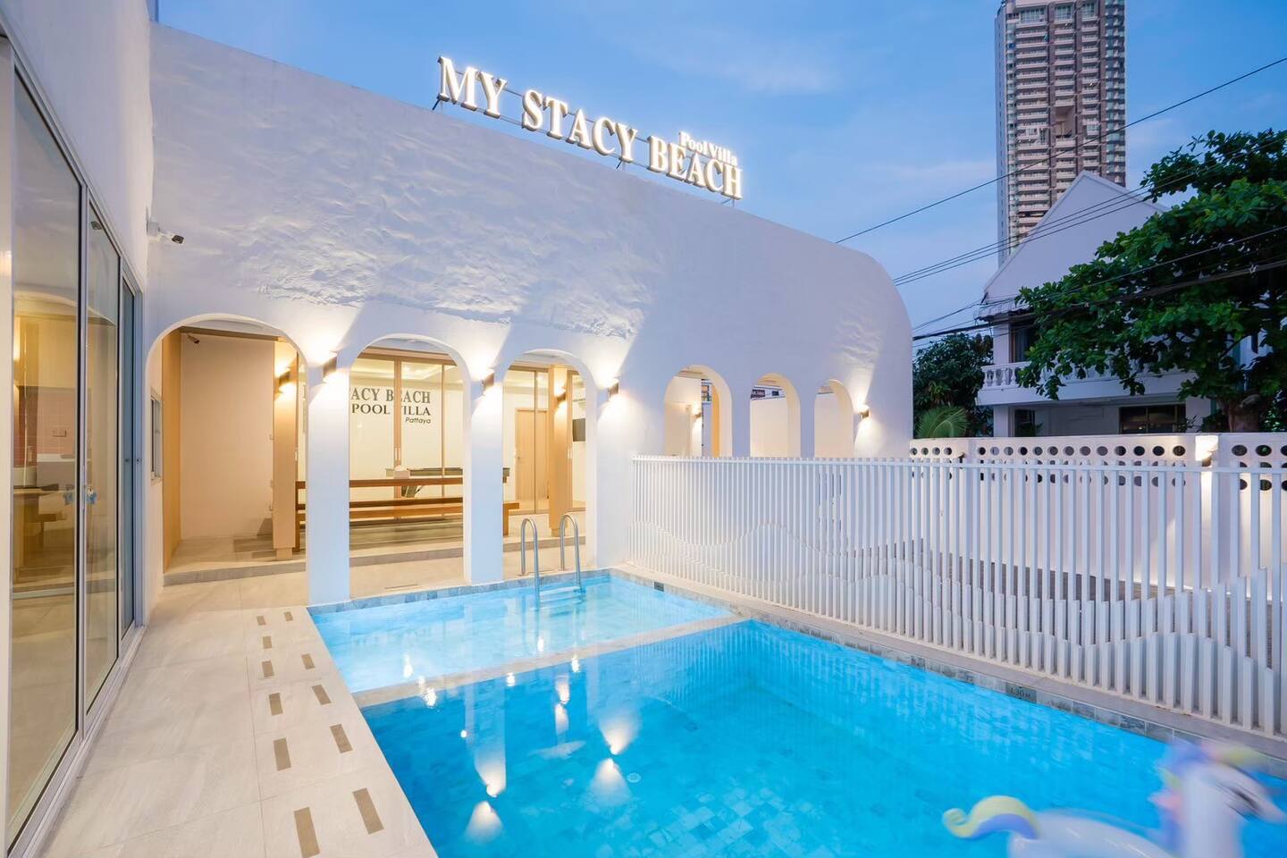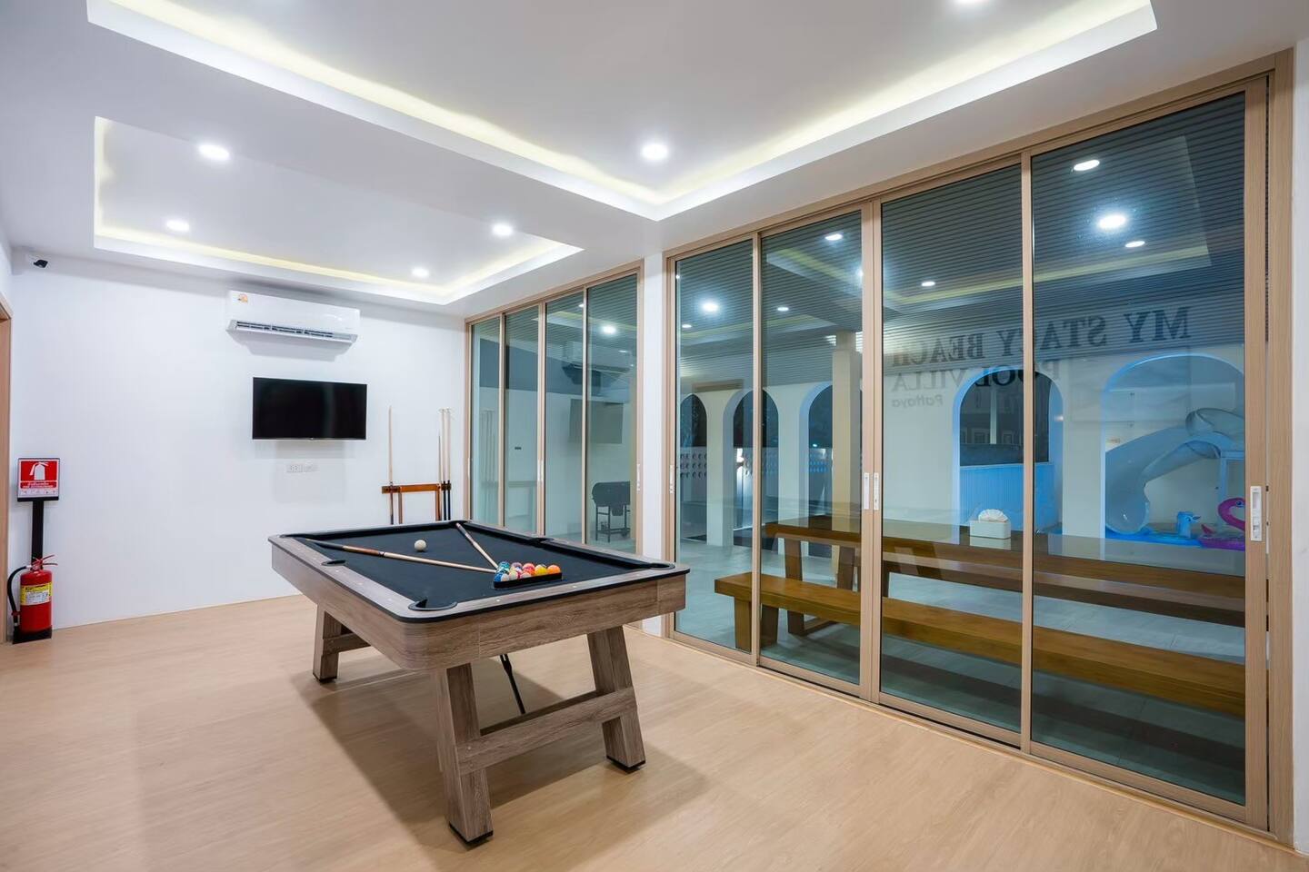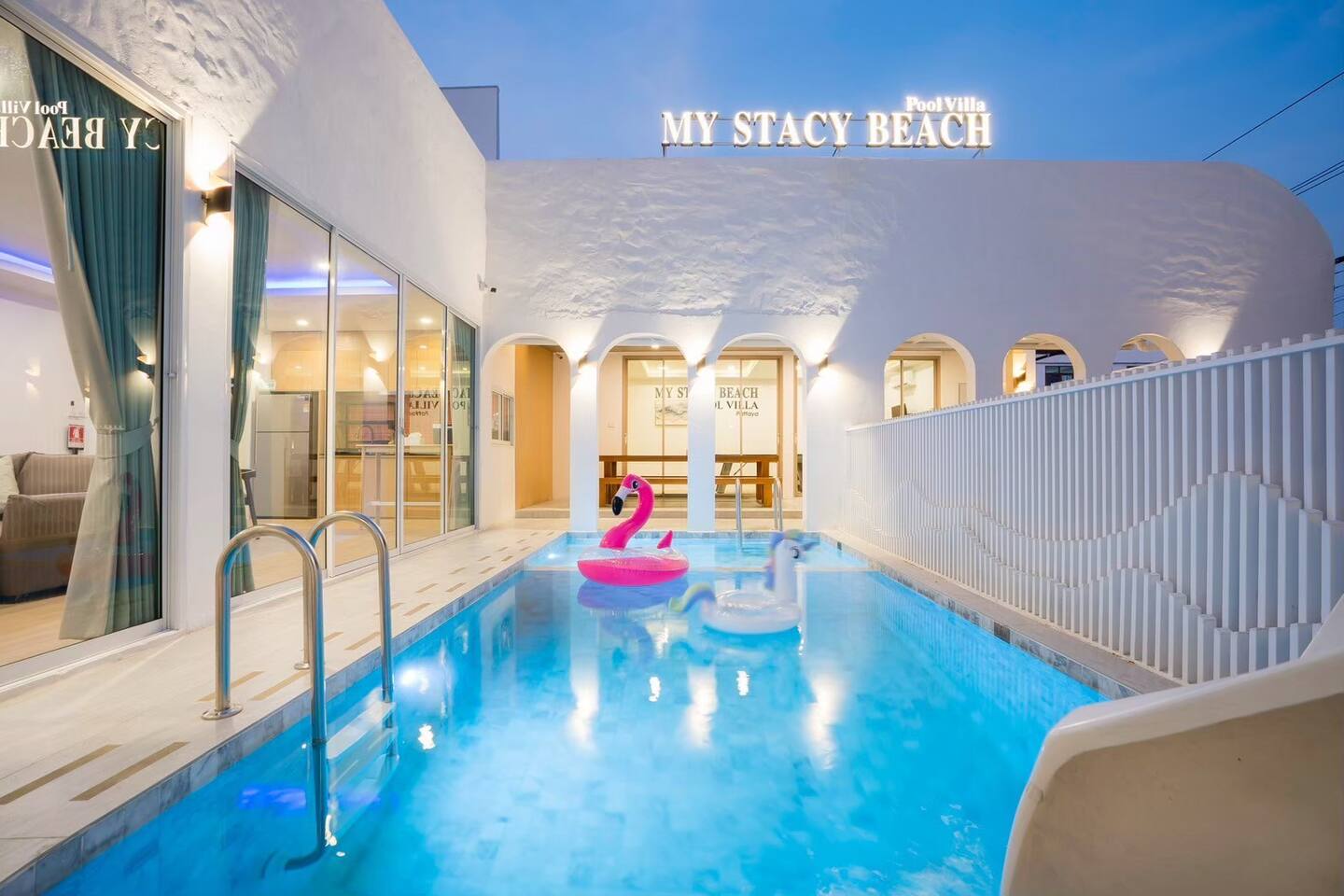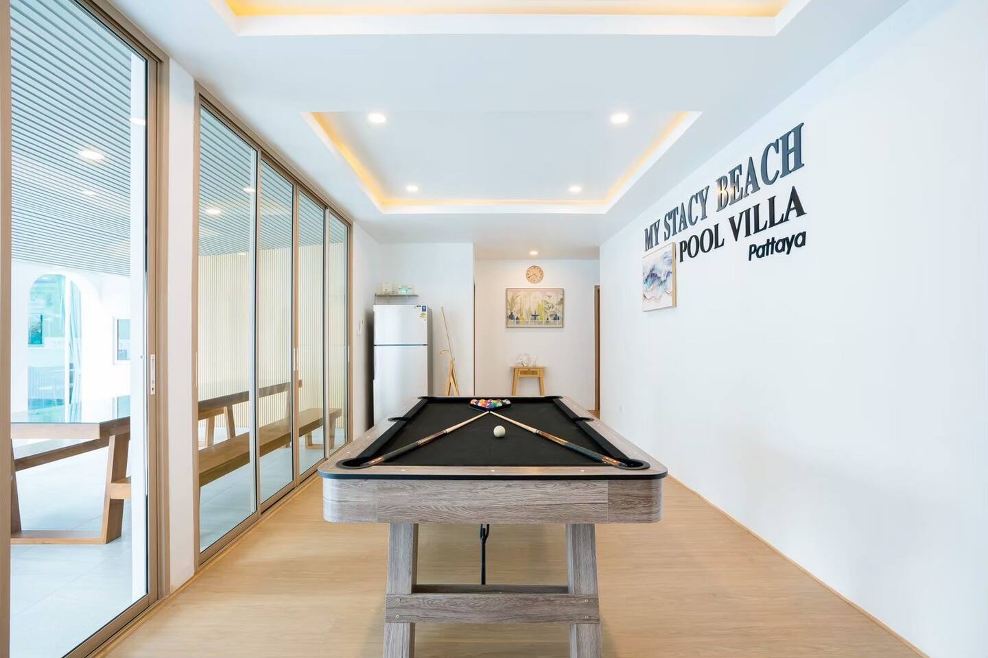 Stacy Pool Villa is a spacious single‑story 4‑bedroom, 5‑bathroom private pool villa designed for families and groups looking for comfort, fun, and convenience. Located just a short walk from Jomtien Beach, the home offers easy access to restaurants, cafés, and local attractions while still providing a peaceful, private retreat. The villa features a private swimming pool with a kids pool, plus a full entertainment setup including karaoke with YouTube, disco lighting, a pool table, fun inflatables, a slide, and a BBQ grill — perfect for gatherings, celebrations, or relaxed weekends away. All bedrooms come with ensuite bathrooms, ensuring comfort for every guest. The kitchen is fully equipped for simple cooking, and the property offers ample parking for multiple cars. It’s an ideal choice for families, large groups, and anyone seeking a comfortable beachside getaway.