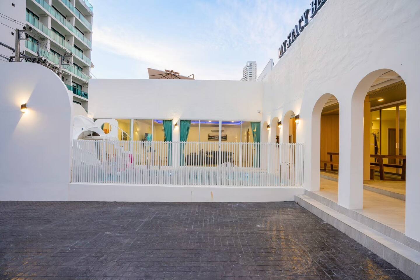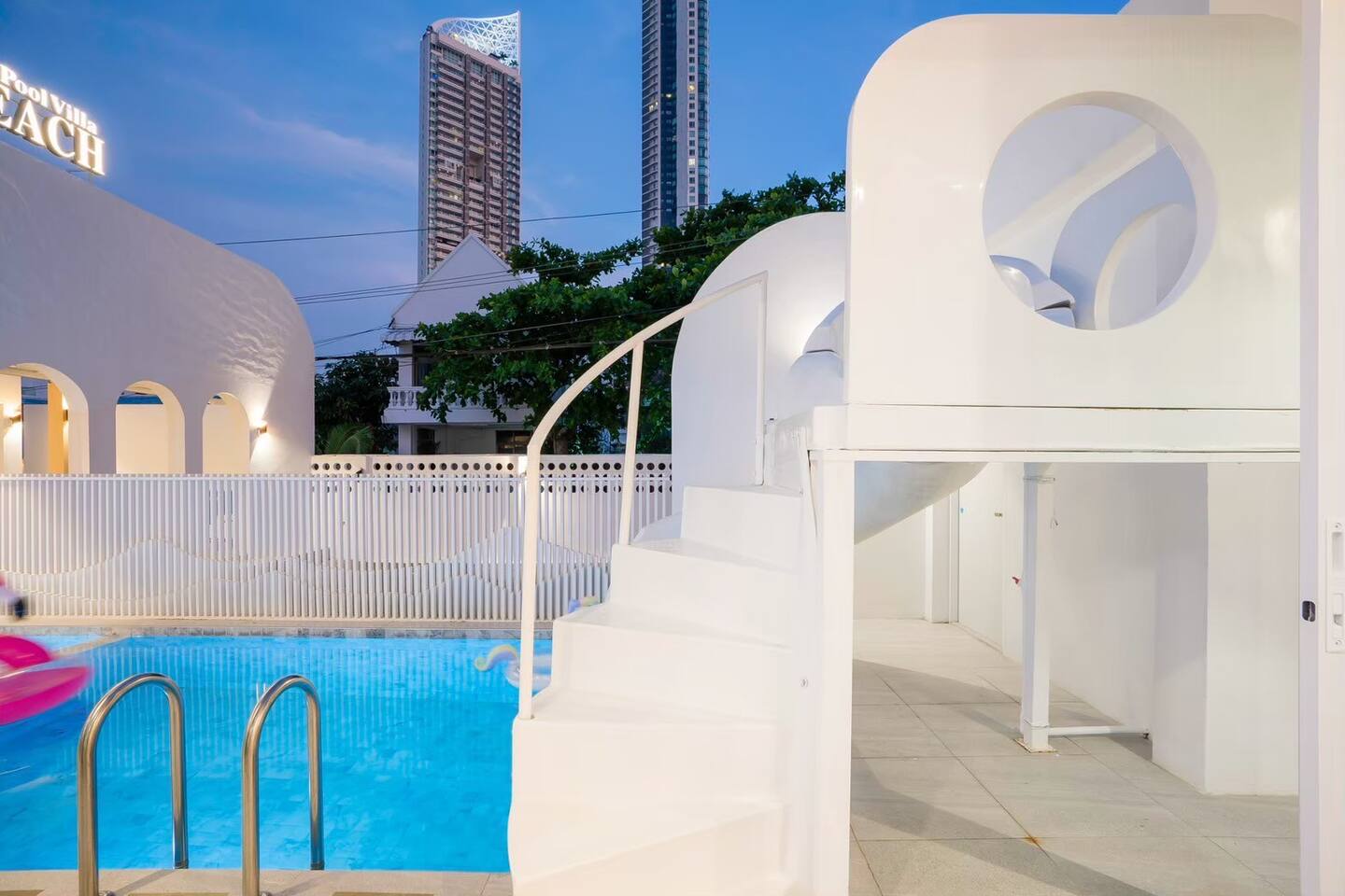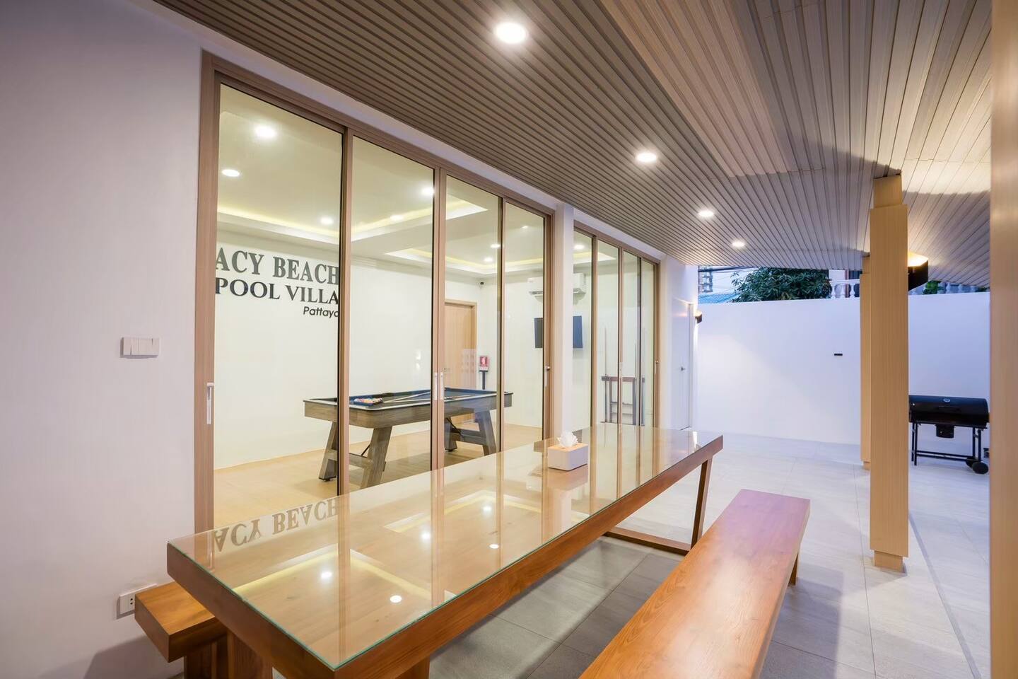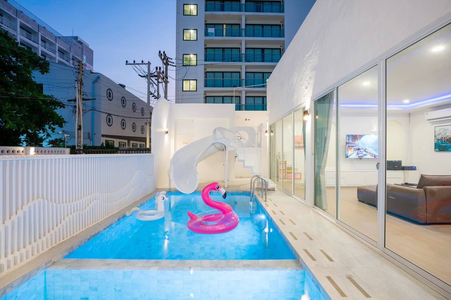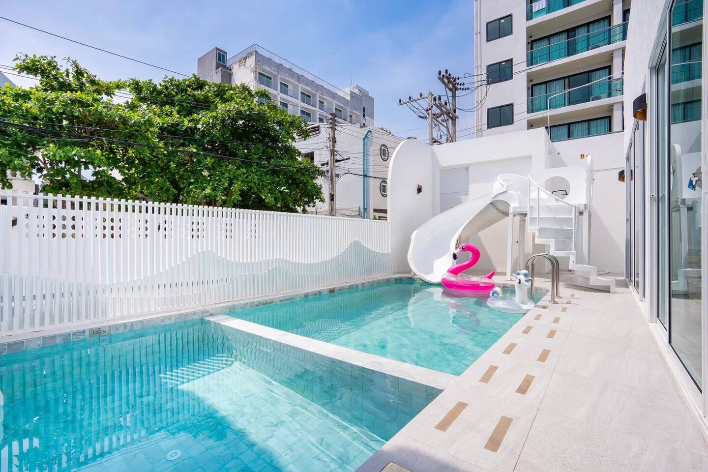 Stacy Pool Villa is a spacious single‑story 4‑bedroom, 5‑bathroom private pool villa designed for families and groups looking for comfort, fun, and convenience. Located just a short walk from Jomtien Beach, the home offers easy access to restaurants, cafés, and local attractions while still providing a peaceful, private retreat. The villa features a private swimming pool with a kids pool, plus a full entertainment setup including karaoke with YouTube, disco lighting, a pool table, fun inflatables, a slide, and a BBQ grill — perfect for gatherings, celebrations, or relaxed weekends away. All bedrooms come with ensuite bathrooms, ensuring comfort for every guest. The kitchen is fully equipped for simple cooking, and the property offers ample parking for multiple cars. It’s an ideal choice for families, large groups, and anyone seeking a comfortable beachside getaway.