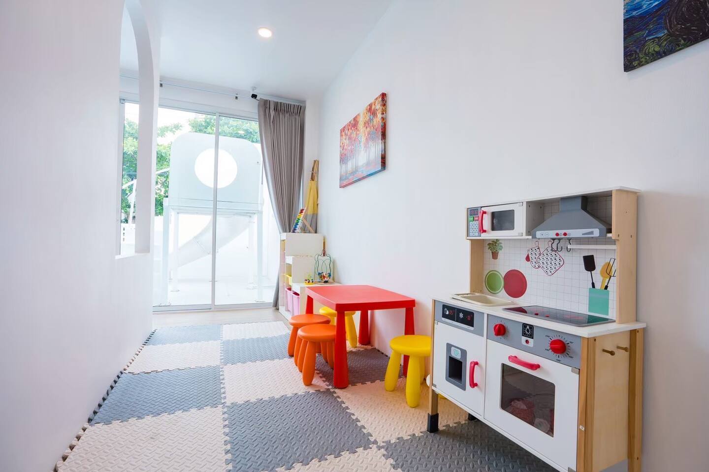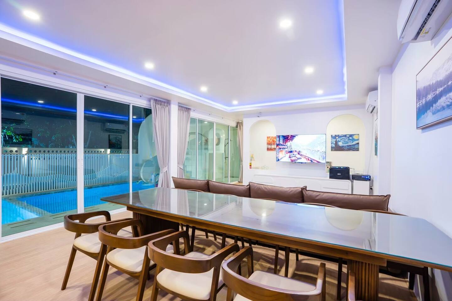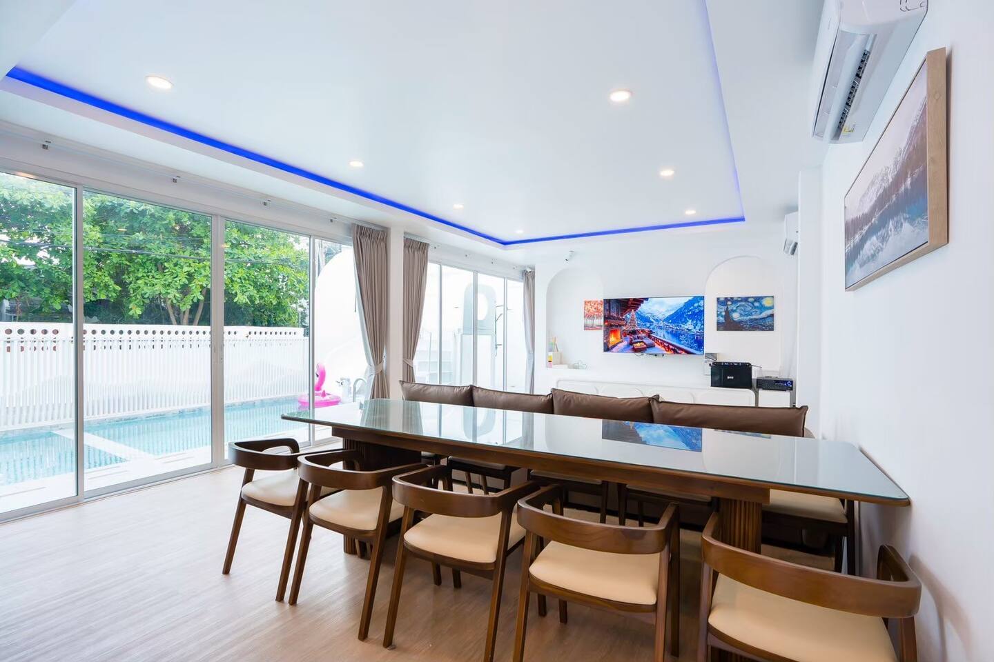 💦 Private Pool + Kids Pool Relax in your private chlorine pool (3.5 × 5 m) or let the little ones splash safely in the kids pool (3.5 × 2 m). Total pool size 3.5 × 7 m — ideal for group fun. 🎉 Entertainment for Everyone Your stay comes with: Karaoke with YouTube connection Colorful disco lighting Pool table Fun inflatable floats Slide BBQ grill for outdoor cooking Perfect for celebrations, gatherings, or a relaxing weekend away. 🐾 Pet‑Friendly We welcome small and medium pets (with a small fee). Just let us know what furry friend you’re bringing. 🛏️ Comfortable Bedrooms All 4 bedrooms come with private bathrooms. Bed setup includes king beds, queen beds, and bunk beds — great for large groups and families. 🍳 Fully Equipped Kitchen Cook with ease using: Electric stove Microwave Hot water kettle Full kitchenware BBQ grill (Just bring your own hotpot/shabu equipment.) 🚗 Convenient Parking Parking for 4 cars inside and 2 cars outside. Note: Buses cannot enter. 🧼Daily Cleaning for 2+ Nights For longer stays, housekeeping provides: Fresh linens & towels Trash removal Tissue restocks Bathroom cleaning