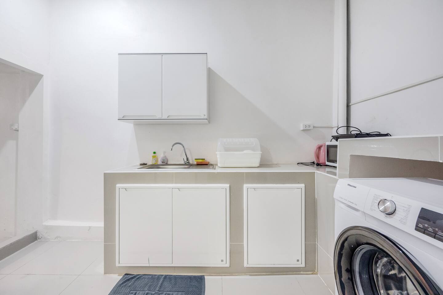 Your Complete Family Base in Bangkok Entire 3-Story House - Full exclusive access to all floors during your stay - 6 bedrooms distributed across floors for family privacy - 7 bathrooms with hot water systems Large communal areas for group activities and dining - Multiple balconies and outdoor spaces Essential Facilities Included - Fully equipped kitchen with refrigerator, microwave, cooking basics - Washing machine and clothes drying facilities Iron and ironing board for family needs - All linens, towels, and basic toiletries provided - First aid kit available for family safety Technology and Entertainment Flat-screen TV with streaming capabilities - Strong WiFi throughout all floors - Multiple power outlets and charging stations - Dedicated workspace area for digital nomad parents Safety and Security - Self-check-in with secure lockbox system - Working security locks on all entry points - 24/7 emergency contact availability - Safe residential location with neighborhood watch